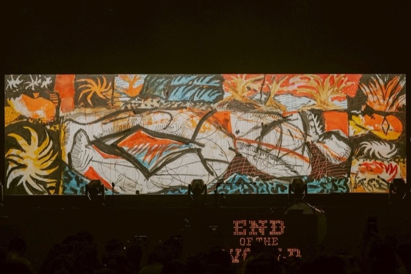 他會在舞台後方現場進行大型畫作, 演唱會結束完成作品,